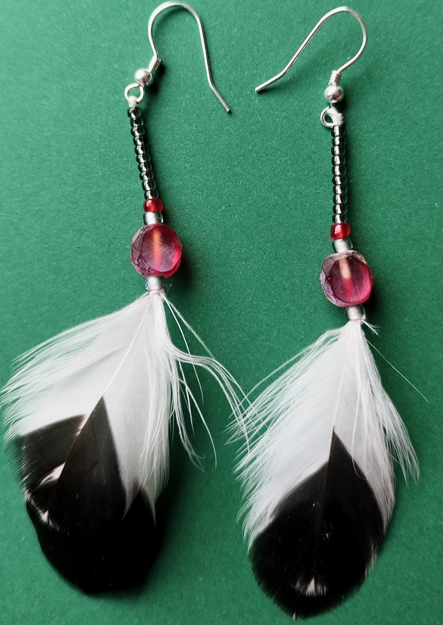 Pírka kohouta, skleněné korálky, stříbrné háčky.