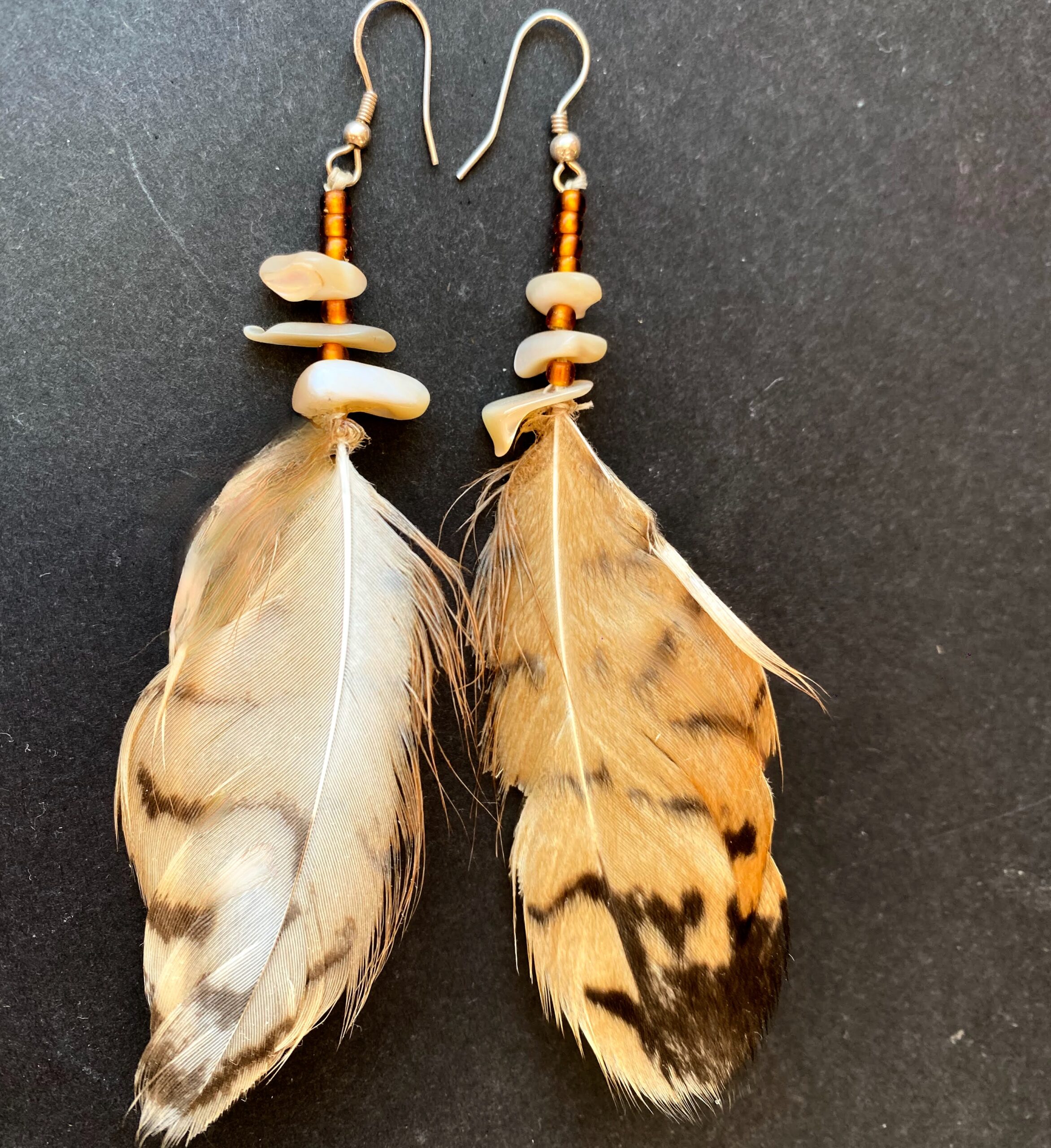 Pírka výra velkého, korálky, perleť a stříbrné háčky.